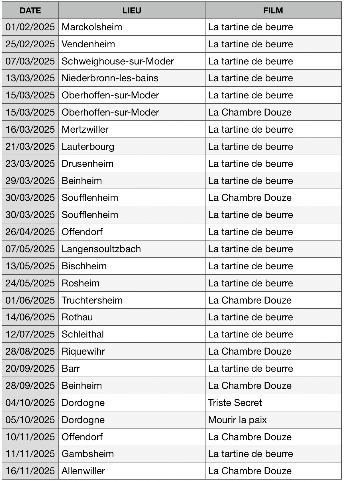 Depuis l’avant-première de notre dernière réalisation « La tartine de beurre » en novembre 2023, maintes projections ont eu lieu et un an plus tard, en novembre 2024, ce film a ainsi été vu par environ 2000 spectateurs qui ont ressenti avec émotion les drames vécus par la famille Heyoppe de Hatten.